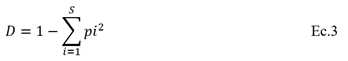 La ecuación 3 conocida como el índice de Simpson D considera dominancia de familias en un ecosistema, es decir, está influenciado por aquellas que tienen una gran proporción de individuos en comparación con las demás familias (17).
