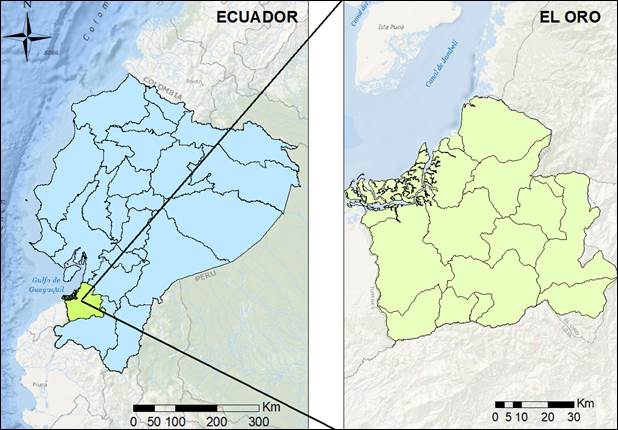 La provincia de El Oro, ubicada en el suroeste del Ecuador, constituye el área de estudio (Figura 1). Tiene una extensión aproximada de 5 767 km² y presenta un gradiente altitudinal que va desde los 0.5 hasta los 3900 msnm. Esta variabilidad topográfica, junto con la influencia de diversas ecorregiones, da lugar a una alta heterogeneidad ambiental, con presencia de aproximadamente 15 sistemas ecológicos diferenciados (11).