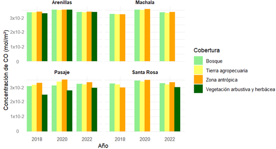 En Santa Rosa, las concentraciones de CO fueron relativamente homogéneas entre las coberturas de bosque, tierra agropecuaria y zona antrópica, con valores que se mantuvieron en un rango simular a lo largo de los años. La vegetación arbustiva y herbácea, sin embargo, tendió a presentar concentraciones ligeramente inferiores en comparación con las otras coberturas en este cantón.