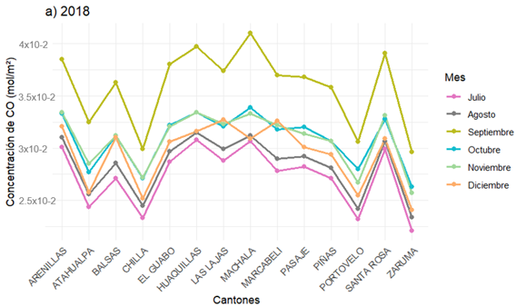 En el año 2018 las mayores concentraciones de CO, representadas por las tonalidades rojizas (3.24x10-2-3.63x10-2 mol/m²), se localizan principalmente en una franja que abarca la zona costera y se extiende hacia el interior, cubriendo parcialmente los cantones antes mencionados. Hacia el este el sur de la provincia, las concentraciones tienden a disminuir, mostrando tonalidades amarillas y azules (2.13x10-2-3.01x10-2 mol/m²), lo que representa menores emisiones o una mayor dispersión del contaminante en estas áreas.