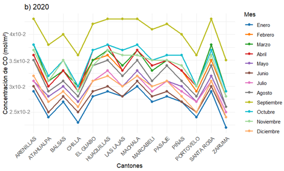 En 2020, las concentraciones de CO fueron más consistentes entre meses, pero con valores generales levemente superiores a los de 2018, destacando nuevamente septiembre como el mes con mayor carga de CO en la atmósfera (hasta 4.3x10-2 mol/m² en cantones como Santa Rosa). Octubre y marzo también mostraron concentraciones significativas, lo cual puede estar asociada a una reducción momentánea de restricciones de movilidad por la pandemia de COVID-19, lo que elevó las emisiones. Por otro lado, enero, julio y agosto presentaron valores menores, oscilando entre 2.4x10-2 y 3x10-2 mol/m². El patrón más uniforme sugiere un impacto atípico por las medidas sanitarias implementadas en ese año, coincidiendo con estudios como (23) el de sobre la influencia de la pandemia en la calidad del aire. Ver figura 12