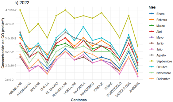 En 2022, se identificó un repunte generalizado en las concentraciones de CO en comparación con 2018 y 2020. Septiembre se mantuvo como el mes de mayor concentración, con valores que alcanzaron hasta 4.5x10-2 mol/m² en Machala y Santa Rosa, consolidando una tendencia de incremento en este mes a lo largo de los años. Octubre y marzo también reportaron altos niveles, reflejando posiblemente un retorno a la normalidad en las actividades económicas y de transporte. En cambio, julio y diciembre nuevamente registraron los niveles más bajos, especialmente en Zaruma y Piñas. Este comportamiento sugiere una recuperación de las fuentes emisoras tras la pandemia, reforzando la necesidad de un monitoreo sostenido y políticas de mitigación en zonas urbanas con alta densidad vehicular e industrial. Ver figura 13