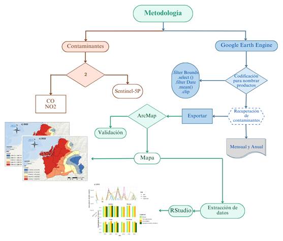 Las concentraciones de NO2 y de CO fueron obtenidas desde la plataforma GEE, a través de scripts de codificación que permitieron filtrar los productos satelitales Sentinel-5P. Finalmente, mediante el software ArcMap se integraron los datos de contaminación con las coberturas de suelo, lo que permitió construir mapas temáticos y generar una base de datos apta para el análisis espacial temporal.