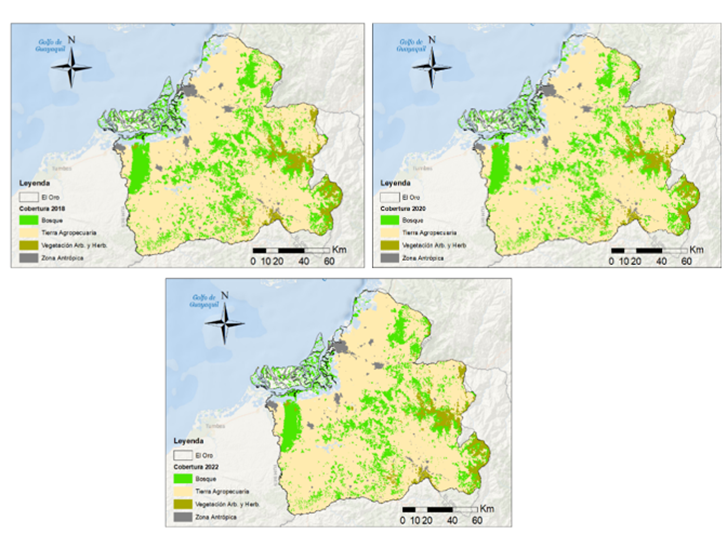 Figura 3 Distribución espacial de cobertura y uso del suelo en la provincia de El Oro (2018, 2020, 2022)