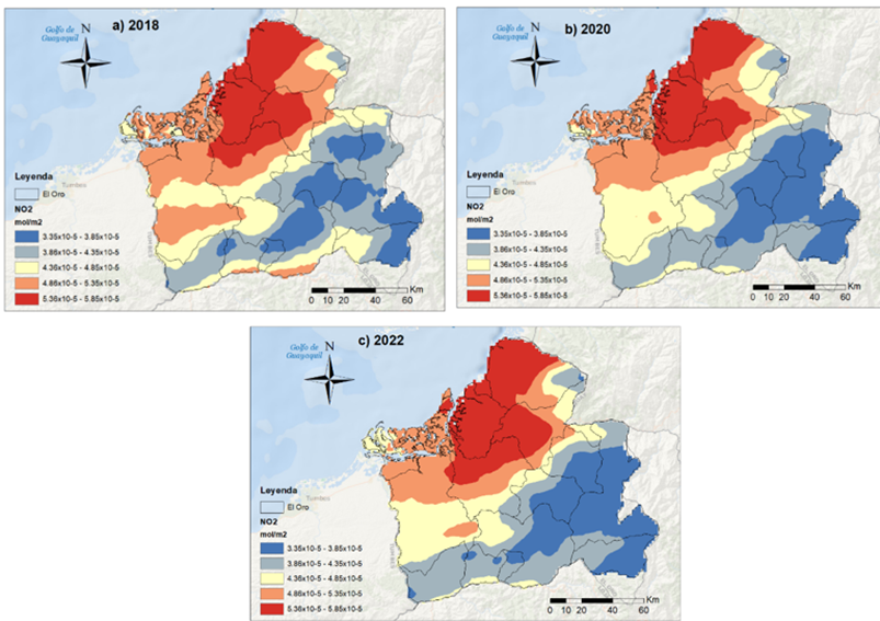 Los mapas de concentración de NO₂ revelan una distribución espacial persistente con máximos localizados en el norte y noroeste de El Oro, particularmente en los cantones de Machala, Santa Rosa y Pasaje. En 2018, estas zonas registraron los valores más altos (5.36×10⁻⁵ - 5.85×10⁻⁵ mol/m²), mientras que el sur y sureste presentaron las concentraciones más bajas (3.35×10⁻⁵ - 4.35×10⁻⁵ mol/m²).