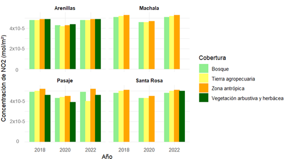 La variación de las concentraciones de NO2 entre los años 2018 y 2022, diferenciada por la cobertura de uso de suelo en los principales cantones de la provincia de El Oro: Machala, Santa Rosa, Arenillas y Pasaje, revela patrones interesantes (Figura 5). En general, se observa una tendencia a la estabilidad o un ligero incremento en las concentraciones de NO2 a lo largo del periodo analizado en la mayoría de coberturas y cantones.