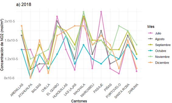 En el análisis mensual de 2018, se observa una notable variabilidad de las concentraciones de NO2 entre los cantones y los diferentes meses del segundo semestre del año. Destacan los meses de julio y septiembre como aquellos con picos elevados en varios cantones, especialmente en Machala y Pasaje, cuyas concentraciones superan los 2x10-5 mol/m², notándose un incremento en las emisiones posiblemente relacionado con mayores actividades vehiculares e industriales propias de estos centros urbanas. Por otro lado, cantones como Atahualpa y Chilla presentan niveles menores, por debajo de 1x10-5 mol/m², lo cual podría atribuirse a su menor densidad poblacional y limitada presencia de fuentes emisoras como tráfico vehicular o procesos industriales. La variabilidad mensual evidencia una influencia estacional, posiblemente relacionada con patrones climáticos y meteorológicos, con menor dispersión de contaminantes en condiciones de baja ventilación atmosférica en ciertos meses (18).figura 6