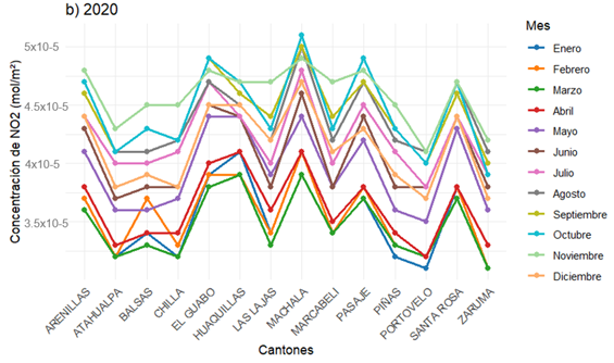 Durante el 2020, año marcado por la pandemia de COVID-19 y las restricciones de movilidad, las concentraciones de NO2 presentaron una disminución relativa en comparación con 2018, aunque siguen siendo elevadas en cantones como Machala, Marcabelí y El Guabo, donde se superan los 5x10-5 mol/m² en los meses de marzo y abril. Esta situación puede parecer contradictoria, pero puede explicarse por la reducción de emisiones de corto plazo durante los confinamientos estrictos seguidos de repuntes posteriores debido al reinicio parcial de las actividades. El patrón más homogéneo a lo largo del año sugiere una menor estabilidad, influenciada por los cambios de dinámica social durante la pandemia (19). Además, la persistencia de altos niveles en zonas urbanas resalta la dependencia de estas áreas del transporte motorizado como principal fuente emisora de NO2(20). Figura 7