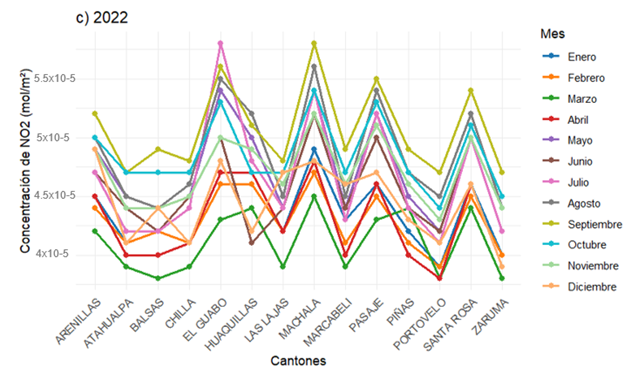 En el año 2022 se observa un incremento generalizado en las concentraciones de NO2 en la mayoría de los cantones respecto a 2020, alcanzando valores máximos superiores a los 5.5x10-5 mol/m², principalmente en los meses de julio y septiembre. Nuevamente, los cantones con mayor densidad poblacional y actividad económica como Machala, El Guabo y Pasaje son los que concentran las mayores emisiones. Esta recuperación de niveles elevados puede atribuirse al restablecimiento de las actividades económicas y la movilidad urbana tras la pandemia. El mes de septiembre destaca por presentar picos elevados en al menos cinco cantones, lo que podría estar relacionado con condiciones meteorológicas desfavorables para la dispersión de contaminantes o con actividades económicas específicas de este periodo. Cabe destacar que, a pesar de los esfuerzos por mejorar la calidad del aire, la tendencia ascendente en 2022 sugiere la necesidad de políticas públicas más rigurosas para el control de emisiones atmosféricas (21). Ver figura 8