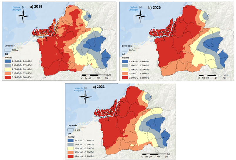 El análisis de las concentraciones de CO en la provincia de El Oro entre los años 2018, 2020 y 2022, representados en los mapas de la fig. 9 respectivamente, revela una distribución espacial heterogénea con áreas de mayor y menor concentración que persisten a lo largo del periodo estudiado. En general, se observa una tendencia a concentraciones más elevadas en la zona costera occidental de la provincia, donde se ubican cantones como Machala, Pasaje, Santa Rosa y Arenillas, así como algunas áreas del centro y suroeste.