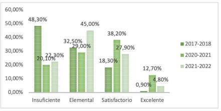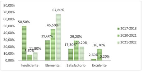 Así mismo, la Figura 2 ha mostrado datos del INEVAL de la prueba Ser Estudiante de las evaluaciones a séptimo grado de los periodos 2017-2018, 2020-2021 y 2021-2022. Como podemos observar el nivel de logro insuficiente varió del 50,50% al 8,60% y llegó al 11,80%, respectivamente. Por otro lado, los niveles que alcanzaron la competencia lectora fueron: elemental, satisfactorio, y excelente sumados; estos fluctuaron entre 49,50%; 91,4%; y 88,20%.