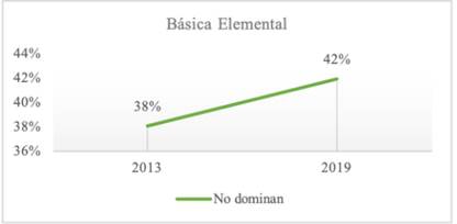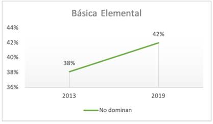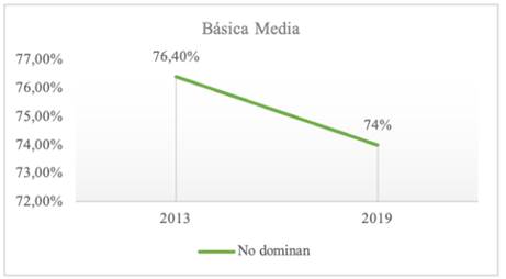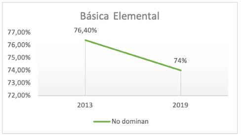 Los resultados proporcionados por el LLECE en sus dos últimas evaluaciones a estudiantes ecuatorianos en Lenguaje mostraron que en la Educación Básica Elemental se ha incrementado en un 3% quienes no alcanzaron la competencia lectora, pasando de 38% a 42% (mirar Figura 3); mientras en la Básica Media ha disminuido en 2.4%, pasando de 76,40% a 74% de acuerdo con la Figura 4. Además, se pudo evidenciar que a medida que los grados avanzaron, el nivel de complejidad aumentó; no solo en los contenidos sino también en la exigencia de las evaluaciones. Así, se tuvo que la escala de esta evaluación determinó que, para Básica Elemental, el nivel básico ha sido el II (revisar Tabla 1); mientras que para Básica Media, el nivel básico es el III (revisar Tabla 2). Está claro que fue el número de quienes no alcanzaron los mínimos en los primeros años escolarizados en comprensión lectora fue alto. Sin embargo, este número a mitad de la Educación General Básica (EGB) ha sido alarmante, donde apenas una cuarta parte llegó a desarrollar la competencia lectora, es decir, uno de cada cuatro.