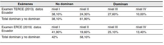 En la Tabla 1, se evidenció la evolución de la comprensión lectora de los estudiantes ecuatorianos de tercer grado, desde una mirada externa, entre el 2013 y el 2019. Según esta mirada, se ha incrementado en 3,9% el número de los estudiantes que no dominan esta competencia, alcanzando el 42%; mientras que en el mismo porcentaje (3,9%) ha disminuido el número de estudiantes que sí dominan la comprensión lectora que llega al 58,10%.