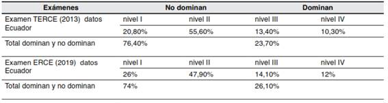 Con base a los datos proporcionados por el Laboratorio Latinoamericano de Evaluación de la Calidad Educativa se hizo una comparación de los resultados entre dos de sus últimas evaluaciones, el TERCE (2013) y el ERCE (2019), realizadas a estudiantes ecuatorianos de 3.er y 6.o grado en el campo de Lenguaje sobre las competencias para la comprensión lectora.