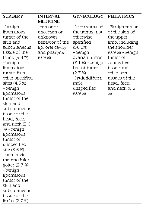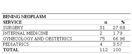Gynecology is the main service that treats benign neoplasms, the most frequent being leiomyomas, ovarian or breast. The second service corresponds to Surgery for the resolution of lipomas.