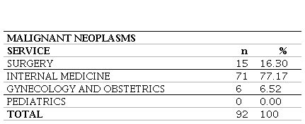 Tables 1 and 2 represent the description of the tumors according to the hospitalization service.