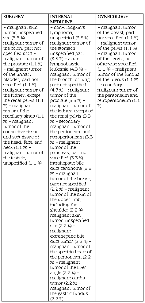 | - malignant skin tumor, unspecified site (3.3 %) - malignant tumor of the colon, part not specified (2.2) - malignant tumor of the prostate (1.1 %) - malignant tumor of the urinary bladder, part not specified (1.1 %) - malignant tumor of the kidney, except the renal pelvis (1.1 %) - malignant tumor of the maxillary sinus (1.1 %) - malignant tumor of the connective tissue and soft tissue of the head, face, and neck (1.1 %) - malignant tumor of the testicle, unspecified (1.1 %) | - non-Hodgkin's lymphoma, unspecified (6.5 %) - malignant tumor of the stomach, unspecified part (6.5 %) - acute lymphoblastic leukemia (4.3 %) - malignant tumor of the bronchi or lung, part not specified (4.3 %) - malignant tumor of the prostate (3.3 %) - malignant tumor of the kidney, except of the renal pelvis (3.3 %) - secondary malignant tumor of the peritoneum and retroperitoneum (3.3 %) - malignant tumor of the pancreas, part not specified (3.3 %) - intrahepatic bile duct carcinoma (2.2 %) - malignant tumor of the breast, part not specified (2.2 %) - malignant tumor of the skin of the upper limb, including the shoulder (2.2 %) - malignant skin tumor, unspecified site (2.2 %) - malignant extrahepatic bile duct tumor (2.2 %) - malignant tumor of the specified part of the peritoneum (2.2 %) - malignant tumor of the liver angle (2.2 %) - malignant cardia tumor (2.2 %) - malignant tumor of the gastric fundus (2.2 %) | - malignant tumor of the breast, part not specified (1.1 %) - malignant tumor of the pelvis (1.1 %) - malignant tumor of the cervix, not otherwise specified (1.1 %) - malignant tumor of the fundus of the uterus (1.1 %) - secondary malignant tumor of the peritoneum and retroperitoneum (1.1 %) |
