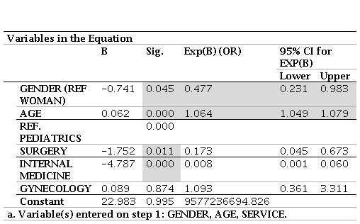 It can be seen that the variables that explain the appearance of neoplasms are sex, age, and belonging to the Surgery or gynecology service. Men are less likely to have a neoplasm (benign or malignant) diagnosis OR 0.477, statistically significant, compared to women.