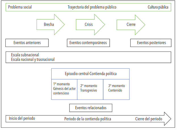 Para la identificación de las etapas de la contienda política se integró el marco conceptual elaborado por McAdam, Tarrow y Tilly (2005). Para dar cuenta de la dinámica de los conflictos ambientales, se descompone el episodio central de la contienda política en tres momentos: un primer momento vinculado a la constitución del actor contencioso, un segundo momento transgresivo abierto y un tercer momento transgresivo contenido de la contienda.