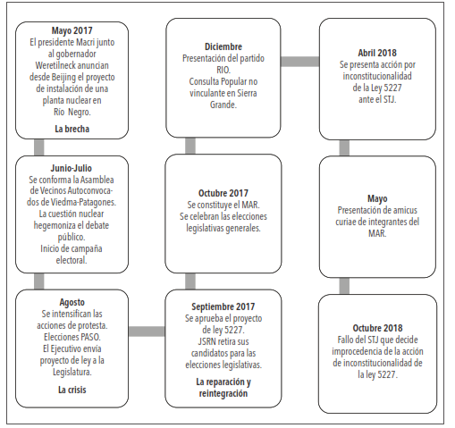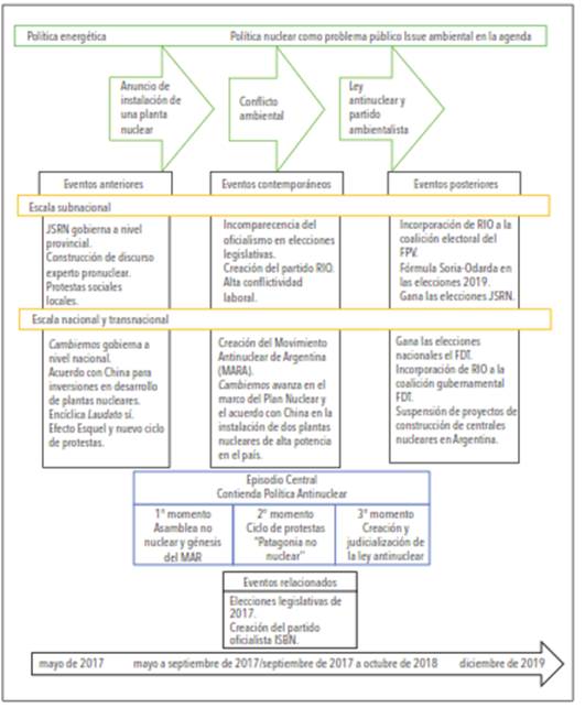 Este subapartado se aboca al estudio de caso de la tematización pública de la política nuclear como conflicto ambiental, a partir de las resistencias sociales y estrategias ciudadanas en rechazo a la instalación de una central nuclear de alta potencia en Río Negro y sus implicancias políticas (2017-2019). El diseño de la trayectoria del problema público (figura 2) y la línea de tiempo (figura 3) en el caso construido se realizaron ajustando las relaciones espacio-temporales entre eventos para configurar la estructura narrativa.