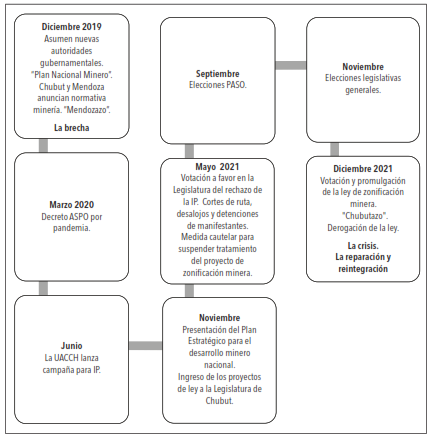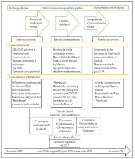 Este subapartado se dedica a la puesta a prueba de la estrategia teórico-metodológica propuesta en el de caso de Chubut. Para ello se elaboraron una estructura narrativa gráfica (figura 4) y una línea de tiempo (figura 5) con los acontecimientos más relevantes, vinculados con los momentos de la trayectoria del problema público ambiental por la política de zonificación minera. En el caso chubutense las etapas de la contienda política tienen distintas intensidades témporo-espaciales y los momentos de la trayectoria del problema ambiental en torno a la minería se superponen. En particular, el pico de la crisis desatado por la aprobación en la Legislatura Provincial de la ley de zonificación minera enviada por el Ejecutivo Provincial y la rápida derogación de esta luego de la semana del “Chubutazo” (15 al 21 de diciembre 2021).