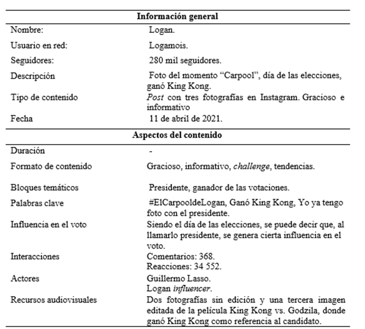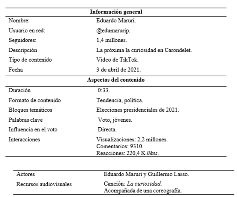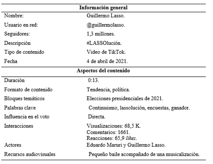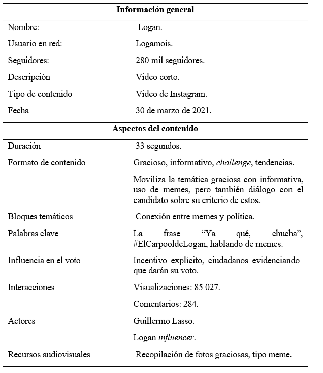 Los contenidos analizados, que se presentan en ocho figuras, corresponden a productos audiovisuales recolectados de las plataformas Instagram y TikTok de Eduardo Maruri y Logan y Logan. También se seleccionaron dos videos cortos pertenecientes a la cuenta de Guillermo Lasso en los que se aparecen estas dos figuras. El criterio para seleccionar el material consideró aquellos elementos que se relacionan con la política y, en específico, con el proceso de campañas electorales por la presidencia del Ecuador en el año 2021.
