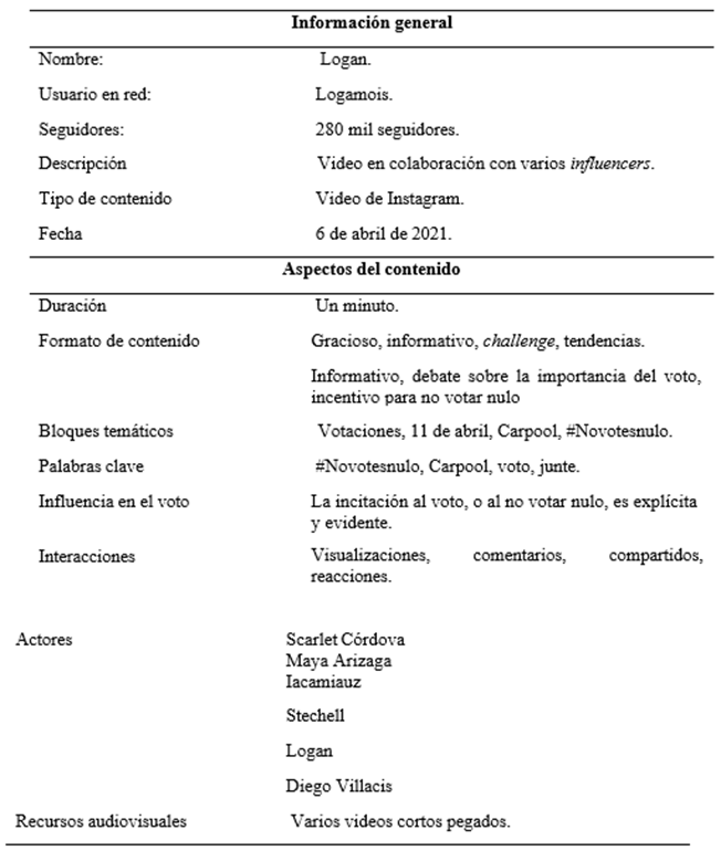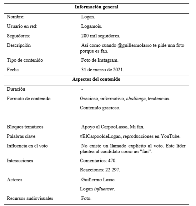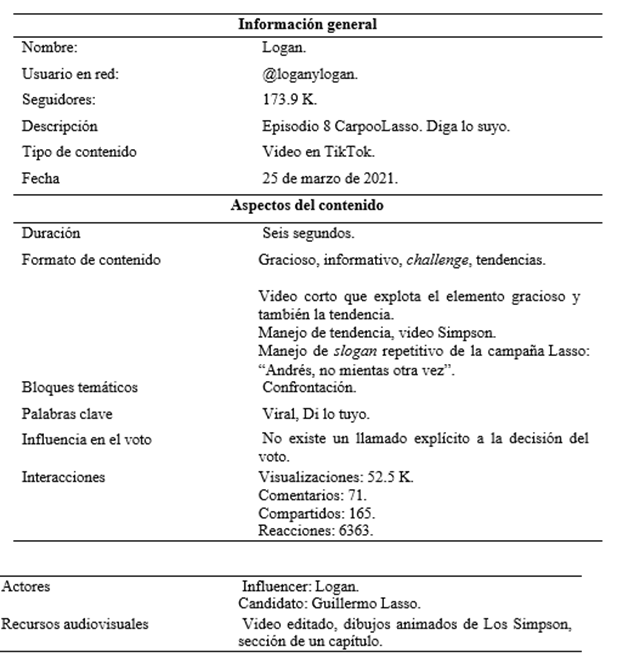 La influencia de este mensaje se multiplica al incluir a varios personajes conocidos en la plataforma, cuyos seguidores son mayormente jóvenes. De esta forma, se suman los seguidores de Logan a la comunidad de quienes participan en el video. Además, destaca que, en la línea de contenido que presenta el influencer, se incluyen varios videos de apoyo a la campaña del candidato Guillermo Lasso. En general, la influencia que se ejerce mediante un discurso breve se centra en dos elementos: no votar nulo y votar por Guillermo Lasso; esta es la experiencia compartida a la que apela el influencer.
