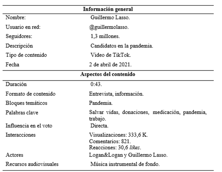 La segunda característica es la simplificación del discurso e imagen del candidato. No se trata de videos informativos; en ambos casos, Logan y Maruri tienen estrategias guiadas por tendencias, entrevistas sobre actos específicos (por ejemplo, el papel durante la pandemia), bailes y coreografías. No hay contenido que revele detalles sobre propuestas de campaña, postura ideológica, mecanismos de acción o promesas concretas. En contraste, se presenta una imagen simplificada de Guillermo Lasso centrada en atributos como juventud, altruismo, comedia y adaptabilidad al contexto de las redes sociales.