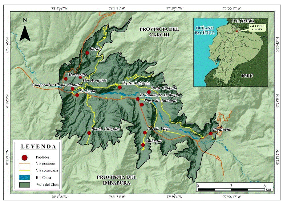 El área de estudio de la presente investigación corresponde al valle seco del río Chota, localizado al norte del Ecuador entre las provincias Imbabura y Carchi, entre los meridianos 78◦ 15’ y 77◦ 55’ de longitud Oeste, y paralelos 0◦ 30’ y 0◦ 7’ de latitud Norte (Espín Díaz, 1999). Esta área presenta una superficie de 9247 ha y se caracteriza por ser un valle encajonado dentro de la hoya del Chota (Figura 1), situado entre las dos estribaciones de la cordillera de los Andes (Winckell et al., 1997). También se caracteriza por presentar un relieve de llanura y penillanura, considerando que el principal cauce que lo atraviesa es el río Chota. El valle del Chota presenta una formación vegetal de matorral seco montano bajo (Sierra, 1999) y está ubicado entre los 1500 a 1800 m.s.n.m (Espín Díaz, 1999). De acuerdo con la clasificación climática de Pourrut (1983), el clima del valle se considera megatérmico árido a semiárido con una temperatura media anual promedio de 17,2 a 19,5◦C y una precipitación media anual que varía entre 559 y 945 mm. La vegetación característica de la zona está compuesta principalmente por algarrobo (Acacia macracantha y Mimosa pudica), huarango (Mimosa quitensis), ovo (Spondias mombin), fréjol (Phaseolus vulgaris), fréjol guandul (Cajanus cajan) y caña de azúcar (Saccharum officinarum) (Mena, 2001).