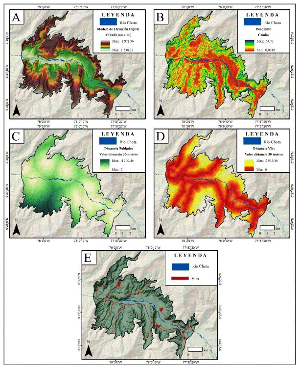 Figura 2 Variables estáticas y dinámicas: a) modelo de elevación DEM y, b) pendientes, c) distancia euclidiana de los poblados, d) distancia euclidiana de vías y, e) vías.