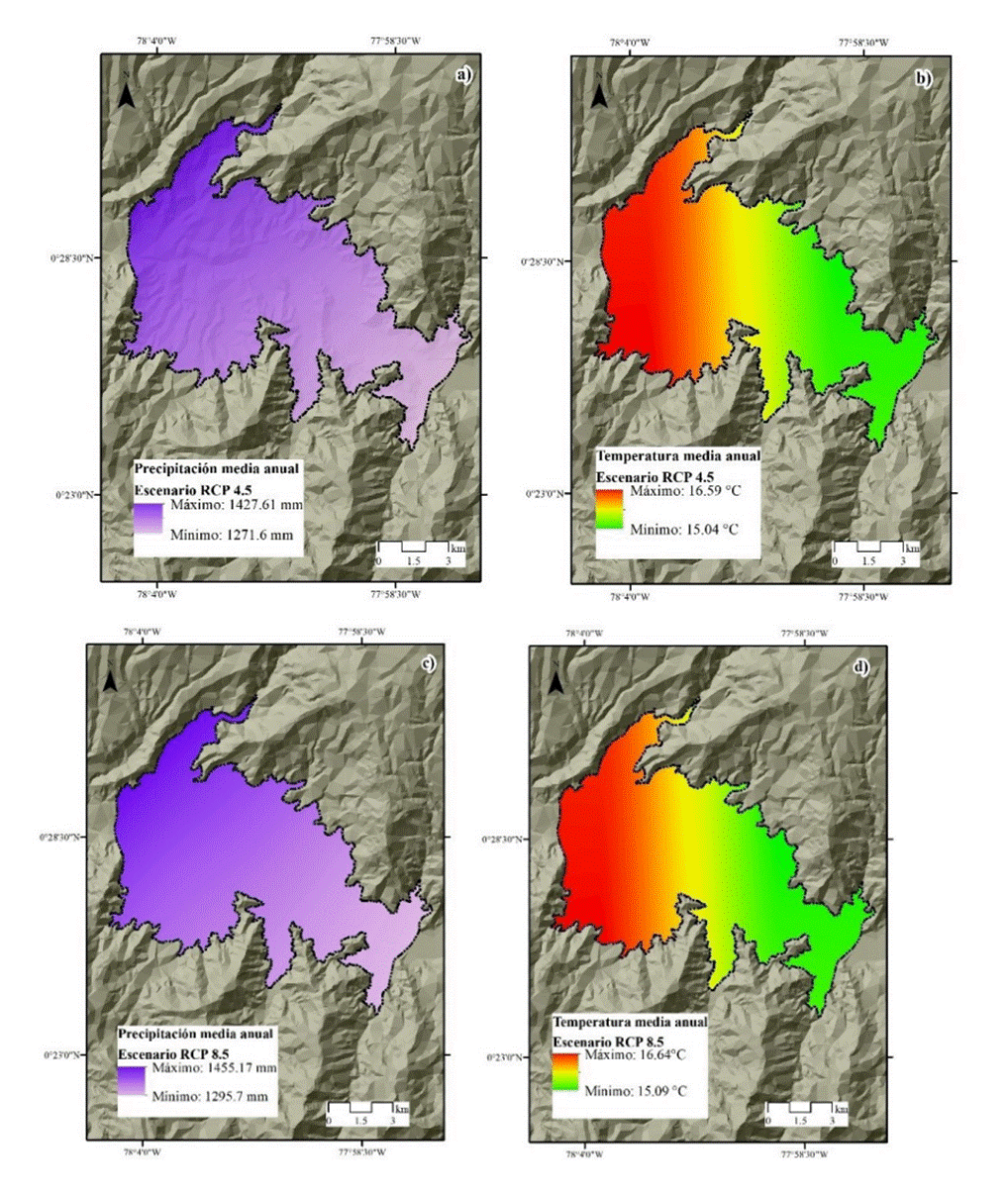 Figura 3 Interpolación de la precipitación y Temperatura a futuro para el periodo 2025-2035. a) Precipitación bajo escenario RCP 4,5, b) Temperatura bajo escenario RCP 4,5, c) Precipitación bajo escenario RCP 4,5, e) Temperatura bajo escenario RCP 8,5.