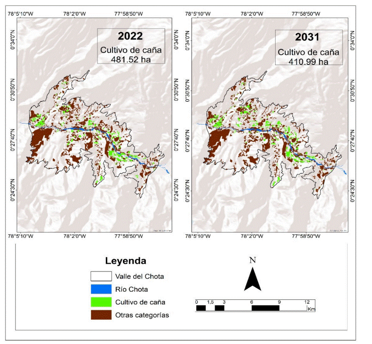Estos datos confirman que los agricultores deberán adaptarse a las nuevas condiciones del cultivo de caña de azúcar bajo los probables efectos del cambio climático, sean estos positivos o negativos. En Ecuador, de acuerdo con las proyecciones de rutas de concentración representativas (RCP, por sus siglas en inglés), la temperatura nacional podría incrementar en 2 ◦C, con excepción de la región Amazónica e Insular (Ministerio de Ambiente de Ecuador, 2019). Este cambio en la temperatura propiciará la reducción de la capacidad adaptativa de las ciudades ecuatorianas al cambio climático (Arias-Muñoz et al., 2022), y sin duda alterará los rendimientos de cultivos, como la caña de azúcar. Aunque los rendimientos futuros de la caña de azúcar no solo pueden verse afectados por los impactos del cambio climático, también son afectados por las dinámicas propias del cambio de uso de suelo. Es así como el objetivo del presente estudio fue determinar la superficie actual de caña de azúcar, año 2022, y proyectar su superficie al año 2031 bajo un escenario normal con tendencia al cambio de uso de suelo y bajo dos escenarios de cambio climático (RCP 4,5 y RCP 8,5). De este modo, se evaluaron los cambios de uso de suelo mediante la aplicación de matriz de transición y se proyectó el uso de suelo, que incluyó la cobertura de caña de azúcar mediante el uso de cadenas de Markov.