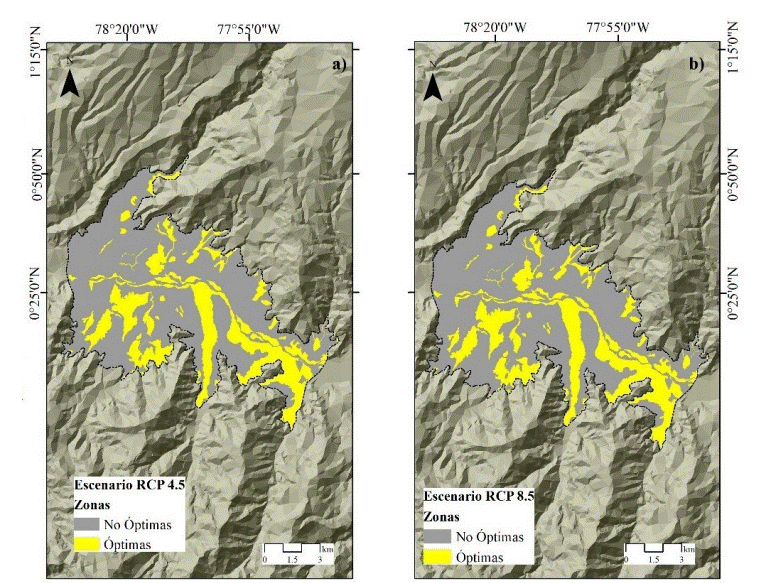 Después, los requerimientos agroecológicos de temperatura y precipitación fueron reemplazados por los valores estimados en los escenarios RCP 4.5 y RCP 8.5. Los datos de proyecciones climáticas fueron obtenidos del Informe de Proyecciones Climáticas de Ecuador desarrollado por el Ministerio de Ambiente, Agua y Transición Ecológica (Ministerio de Ambiente, Agua y Transición Ecológica (MAA- TE), 2020). Esta información presenta una simulación a futuro, desarrollada mediante un downscaling dinámico con una temporalidad 1985-2070. Se simulan las probables condiciones de la temperatura y precipitación bajo dos escenarios climáticos denominados sendas representativas de concentración (RCP 4,5 y RCP 8,5). El escenario RCP 4,5 muestra una probabilidad de que la temperatura sea superior en al menos 2 ◦C, y el escenario RCP 8,5 presenta un incremento en la temperatura superior a 3 ◦C (Armenta et al., 2016).