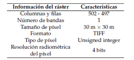 Además, para la proyección del CUS, tal como lo recomiendan Ortega Chuquín and Arias Muñoz (2022), se estandarizaron las características espaciales de las variables predictoras: pendientes, altitud, distancia a vías y distancia a zonas urbanas, junto a los archivos espaciales de los años de referencia de cobertura y uso de suelo (años 1999 y 2011). Para ello se realizó una homologación de la resolución espacial y radiométrica en los archivos geoespaciales (Tabla 1).
