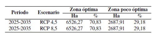 Tabla 7 Áreas óptimas para el cultivo de caña de azúcar en el Valle del Chota bajo escenarios de cambio climático para el periodo 2025-2035
