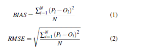 Donde P son los datos pronosticados y O son los datos observados, respectivamente, y N es la cantidad de datos totales.
