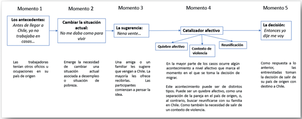 Este estudio presentó una secuencia de cinco ejes temáticos (ver figura 1), comenzando con “Los antecedentes”, que revela cómo las trabajadoras no se dedicaban al trabajo doméstico en sus países de origen. El segundo eje muestra la necesidad de “Cambiar la situación actual” que presentan las participantes, motivada por condiciones económicas o contextuales desfavorables. El tercer eje introduce una “Sugerencia” de una amiga o familiar de emigrar a Chile para trabajar. El cuarto eje, denominado el catalizador afectivo, resalta los elementos emocionales que influencian la decisión de migrar. Finalmente, el quinto eje incorpora la decisión de emprender la migración como culminación de los eventos previos, momento en el cual las entrevistadas dejan su país para comenzar su nueva trayectoria en Chile.