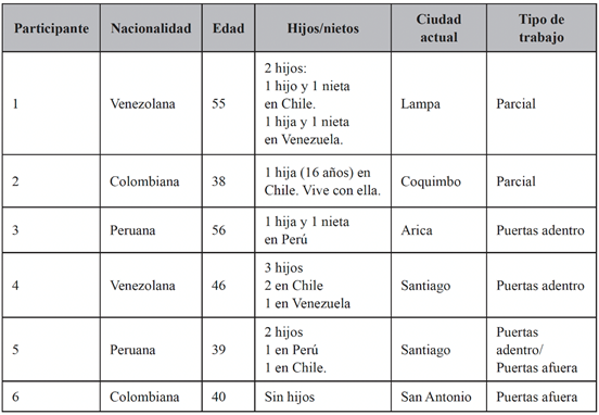 La muestra fue seleccionada no por su tamaño, sino por la riqueza de los datos y las habilidades de la investigadora (Martínez-Salgado, 2012). Se empleó un muestreo teórico (Iñiguez-Rueda, 2018), y los criterios de selección incluyeron: tipo de trabajo (puertas adentro o afuera), existencia de una cuidadora en el país de origen, y participación en organizaciones de trabajadoras migrantes. Estos criterios aseguran un grupo con diversas experiencias y contextos de las trabajadoras migrantes. Se realizaron tres entrevistas biográficas a cada participante.