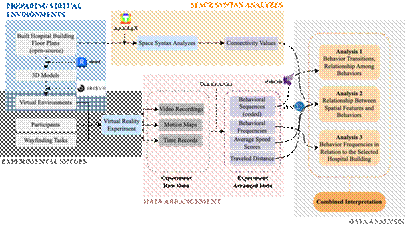 The methodology associated wayfinding behaviors with spatial performance. Based on the literature, we categorized plan layouts and created simulated environments in VR by collecting architectural data. We transferred the data of these buildings to VR software for the experiment. The data on behavior and time were gathered by observing VR experiments. Then, utilizing space syntax tools, we conducted visibility analysis to collect C values. After associating the C values with the corresponding behavioral data, we interpreted the results both separately and as a whole.