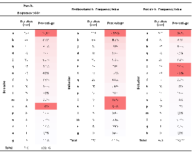 BSA requires a set of sequential actions and their respective codes. We grouped the behaviors observed during the experiment and assigned letter codes to behaviors as seen in Table 4. We analyzed the videos, recorded the behavioral sequences, and calculated the frequency of each behavior by duration.