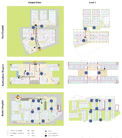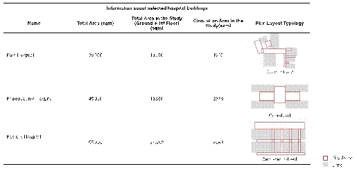 Three real hospital buildings were chosen to test common space layouts for hospitals, based on specific selection criteria as follows: