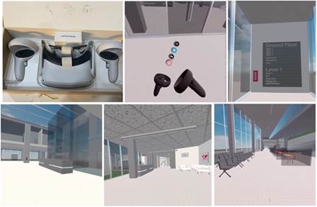 Participants performed wayfinding tasks in VR hospital environments based on partial 3D models. Iris VR was used to transfer models into VE’s. Only three participants were included to limit the analyzed data. The participants' ages varied between 25-30 and they had no prior VR experience. Two of them were architects while one was a publisher. All participants received a VR orientation and free time to practice VR at the beginning of the experiment to ensure consistency in the results. Oculus Quest 2 was used as the iVR tool with a headset and two controllers that provided mobility in VE’s (Figure 2). Participants were assigned three different wayfinding tasks in each building in the same order to make them navigate through different routes in the buildings: entrance to a clinic, clinic to the laboratory, and entrance to a ward (Figure 3).