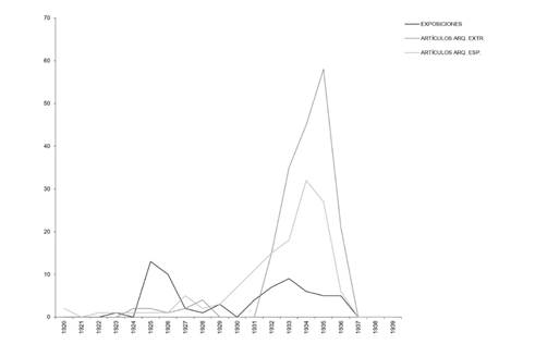 Figure 10 Graph of articles on exhibitions, foreign architects and Spanish architects published in Spanish architectural journals.