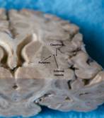 Figure 1 Anatomical specimen at the level of the basal ganglia showing the external capsule and its two boundaries, the putamen and the claustrum (arrows).