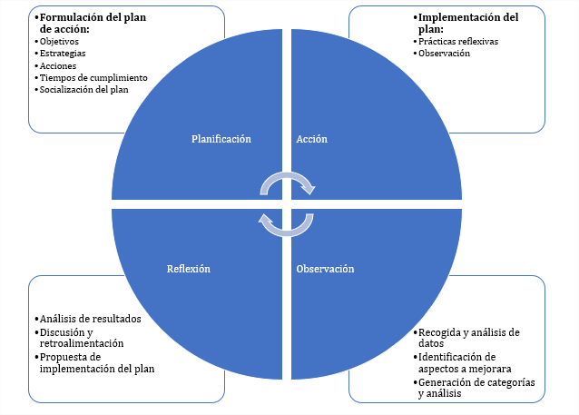 Cáceres, García y Sánchez (2002), Latorre (2003) y Pereyra (2008) entre otros, afirman que la I-AP se caracteriza por ser colaborativa, participativa, democrática, auto evaluativa, interactiva, que permite una retroalimentación continua, facilita una aplicación inmediata, se realiza dentro de un contexto social y contribuye tanto a la ciencia social como al cambio social con una capacidad transformadora tanto del docente como de sus estudiantes. Del mismo modo, para Lewin (1946), Kolb (1984) y, Carr y Kemmis (2003), la metodología I-AP es un proceso que está integrado por cuatro fases o momentos interrelacionados entre sí: planificación, acción, observación y reflexión (Ver figura 1).