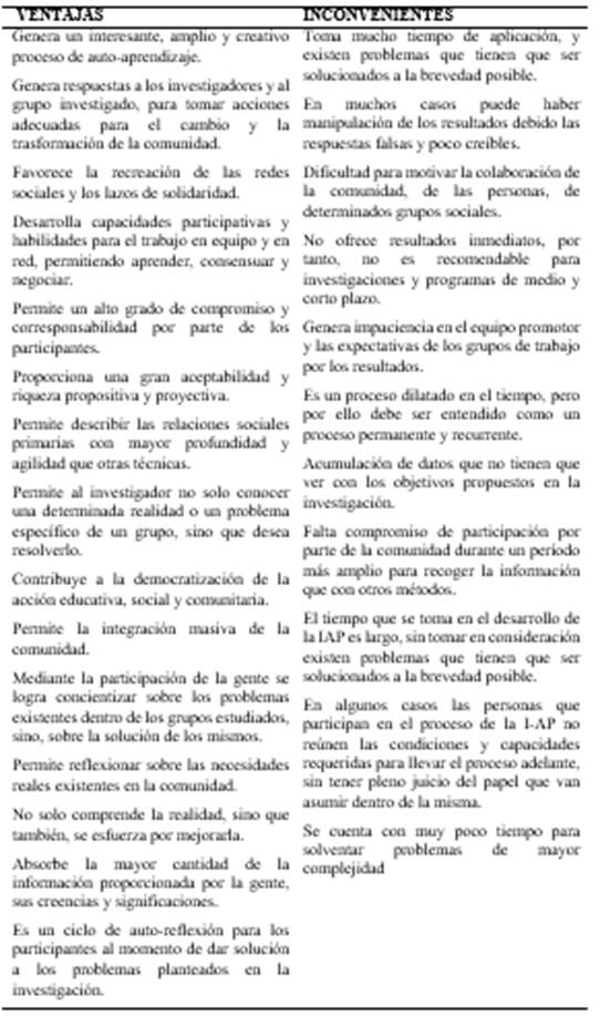 Investigadores como Díaz Méndez 1992, Pérez 2011, Castañeda 2013, entre otros; establecen algunas ventajas e inconvenientes al usar a la I-AP como enfoque cualitativo, para la recogida y análisis de la información con el fin de dar solución a los problemas planteados dentro de un trabajo de investigación (Ver cuadro 1).