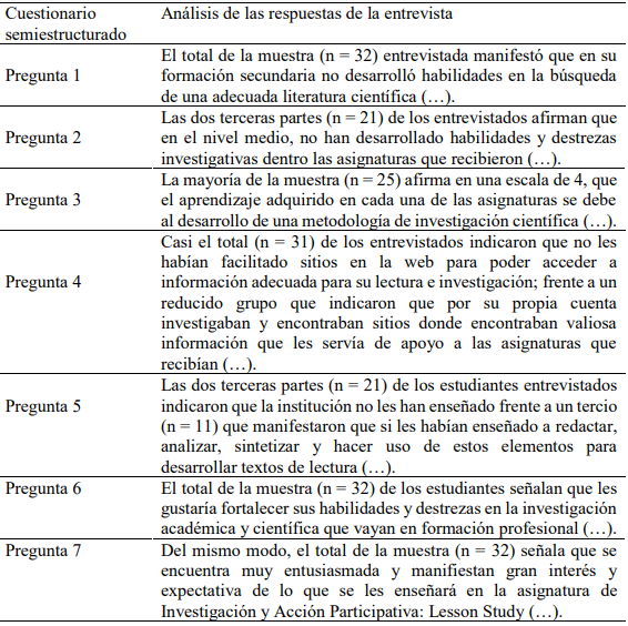 Para la recogida de la información se aplicó la técnica de la entrevista, con la aplicación de un cuestionario semiestructurado de siete preguntas abiertas dirigido a los estudiantes el Primer Nivel de la Carrera de Educación Inicial de la Universidad Técnica de Machala en la asignatura de Investigación y Acción Participativa: Lesson Study (I-AP: LS).