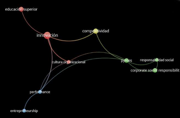 Con respecto a la figura 2, se muestra la red interconectada de palabras clave sobre la innovación empresarial. Se muestra que la palabra "innovación" queda centrada, entendiéndose la más citada, seguido de "educación superior", "competitividad", "pymes", "corporate social resposability", entre otros.