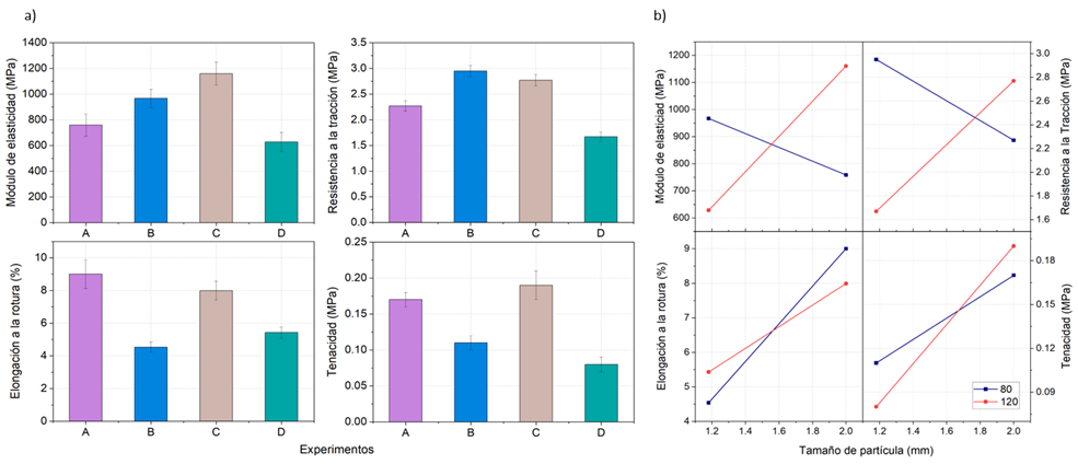Los resultados obtenidos revelan que los experimentos A y C presentaron elongación a la rotura y tenacidad superiores en comparación con los B y D. Por otro lado, los B y C exhibieron resistencia a la tracción y módulo de elasticidad superiores a los A y D. Es así como el experimento C muestra valores superiores en todas las propiedades mecánicas, atribuibles a un mayor tamaño de partícula y una temperatura de procesamiento más elevada.