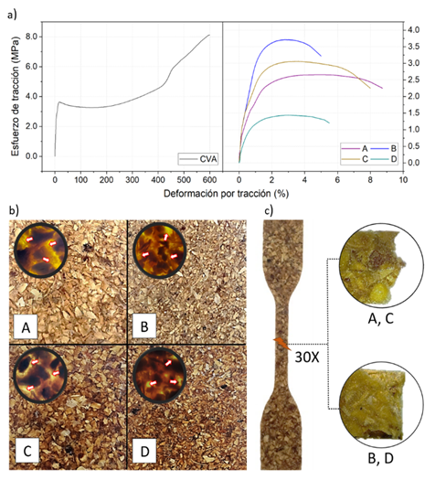 Figura 2 a) Curvas de esfuerzo-deformación de CVA y biocomposites, b) Superficies de biocomposites y visualización a 20X con luz trasmitida, de la distribución y distancia entre refuerzos, c) Fractura de biocomposites, visualización a 30X